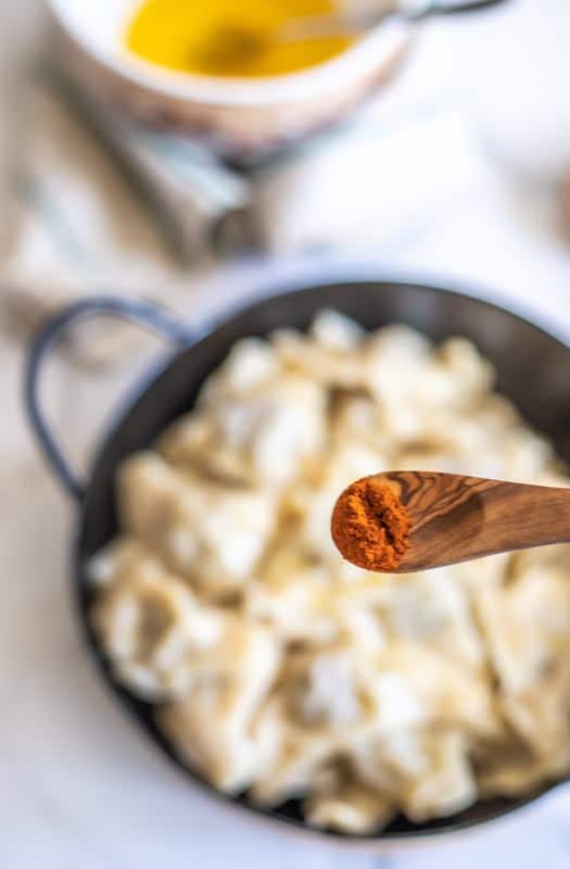 - Sprinkle the buttered klepe with red paprika powder and mix them well