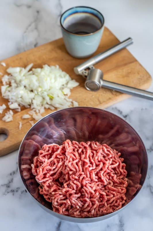 - Mix the minced meat, finely diced onion, garlic (optional), salt, and pepper to taste in a separate bowl. Set aside, as you will use this mixture as a stuffing for the klepe