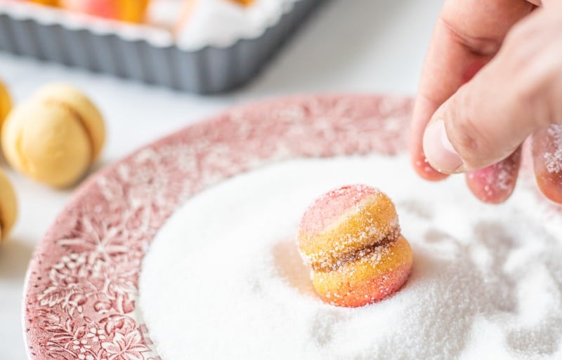 - Arrange the peaches on a paper towel. Once you have about 6, carefully roll them in a bowl of sugar. And repeat till you have finished