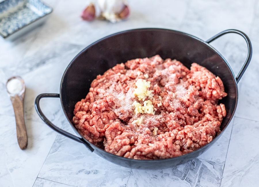 - Cut all of the meat into small cubes and season with salt and minced garlic. Place it in the fridge for 24 hours. (If you buy the meat pre-minced, you can add the garlic and salt and move to step 3 after 8 hours)